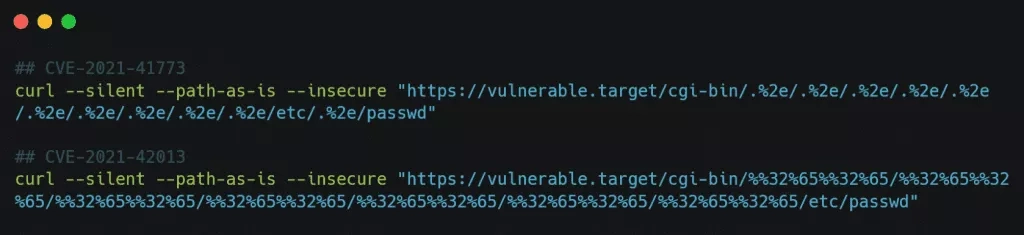 A specially crafted curl command can also be used for checking whether a single target application is vulnerable to CVE-2021-41773 and CVE-2021-42013: