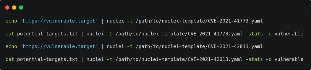 Nuclei vulnerability scanning templates are also available at GitHub Nuclei Template – CVE-2021-41773 and GitHub Nuclei Template – CVE-2021-42013 for identification and exploitation of CVE-2021-41773 and CVE-2021-42013 respectively. The nuclei templates can be used for scanning single target and mass scanning potential targets: