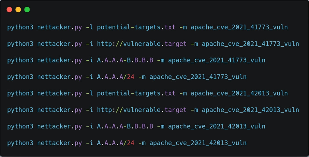 OWASP Nettacker is also effective in the identification of CVE-2021-41773 and CVE-2021-42013. It can be used for scanning the targets from a list, entire subnets, domains along with subdomains and IP ranges by running the following commands mentioned in the below screenshot: