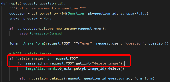 Going through the “views.reply” function, the researcher discovered that if you provide a “delete_images” Post parameter, it will delete any image with the “id” you provide in the “delete_image” parameter, without any checks, if the user deleting the image is the owner of the image.