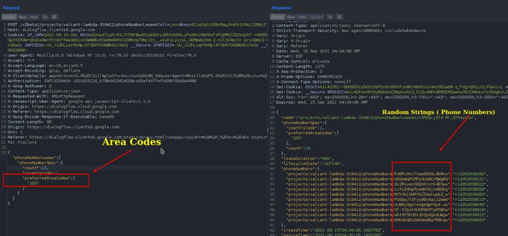 On intercepting the Area code request, some random strings (Phone numbers) were found in response.