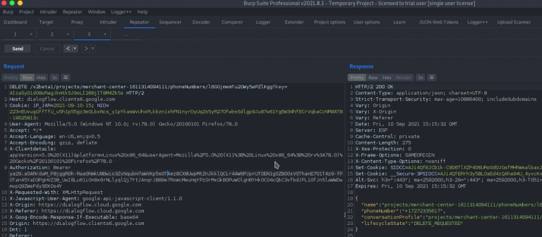 Replacing the random strings (Phone Numbers) in the “delete phone gateway” request, the researcher was successfully able to delete other users’ phone numbers.