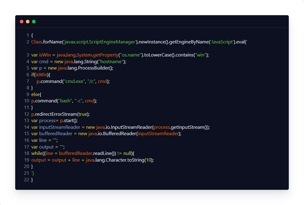 | var bufferedReader = new java.io.BufferedReader(inputStreamReader); | This payload snippet is used for reading the line-by-line data stream of the ProcessBuilder subprocess. |