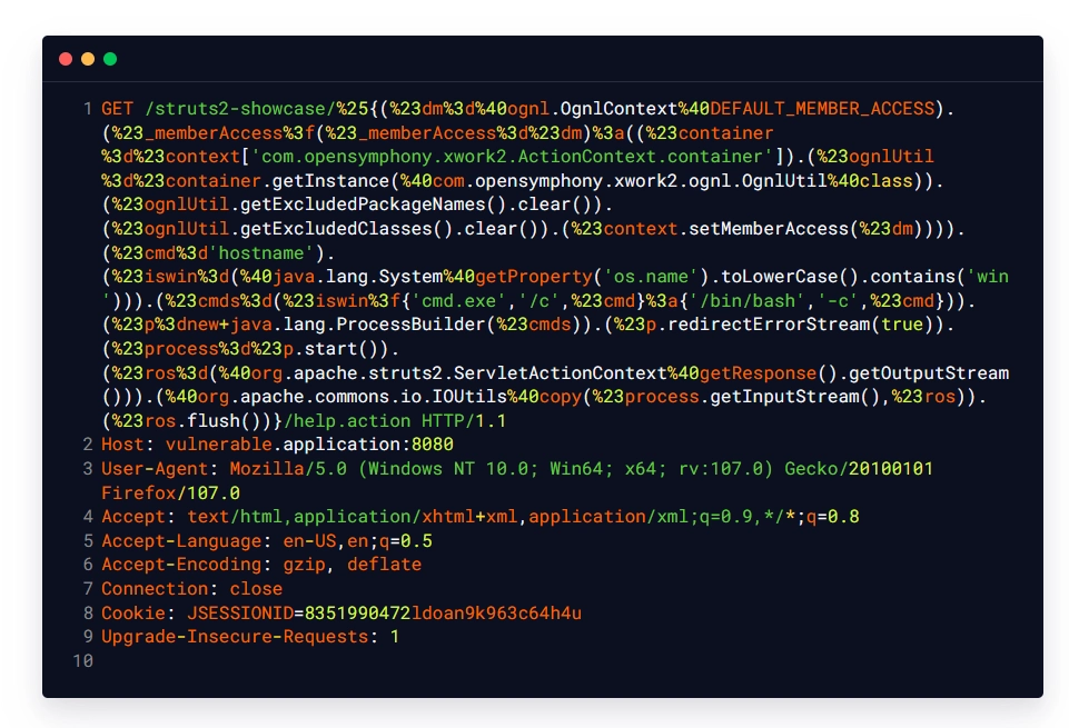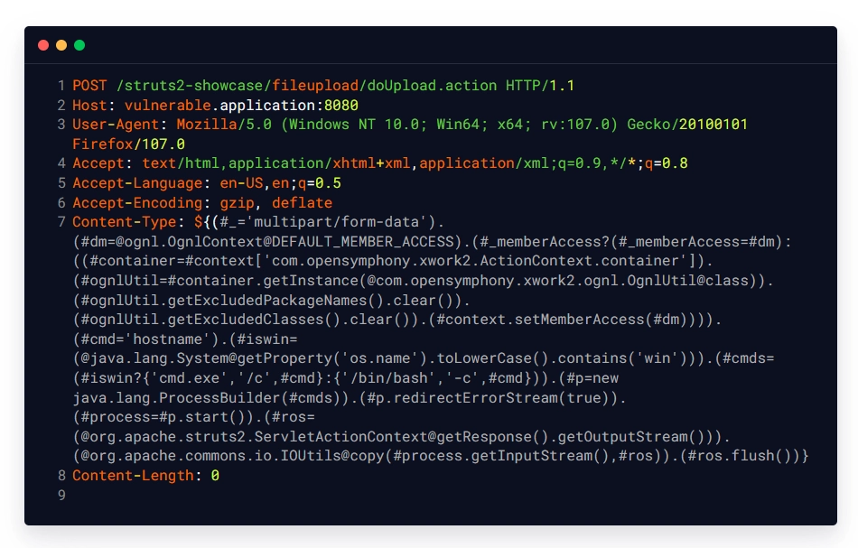 CVE-2017-5638, an OGNL injection vulnerability, was discovered in the Jakarta Multipart parser in Apache Struts 2. This vulnerability is commonly referred to as the Equifax breach. The vulnerability was caused due to the lack of effective exception handling and the generation of verbose error messages during file uploads. This misconfiguration assisted remote unauthenticated adversaries in executing arbitrary commands. The malicious payloads used to achieve command injection were transmitted via the HTTP headers Content-Type, Content-Disposition, and Content-Length.