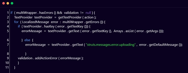 Analysis of the updated code that contained the patch for this vulnerability revealed that the ‘LocalizedTextUtil‘ class [line 6 in the below-mentioned code snippet], along with the ‘java.io.File‘ which was responsible for improperly handling the verbose error messages and eventually leading to code execution, was removed from the Jakarta-based file upload Multipart parser.