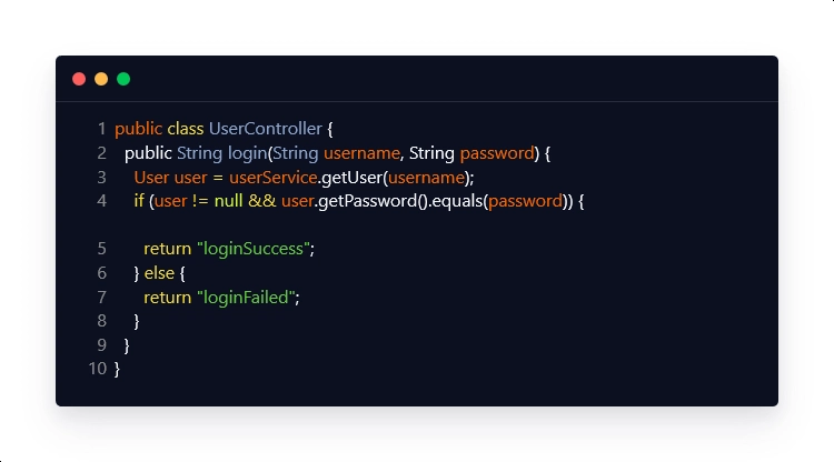 The ‘login’ method in this code snippet receives a 'username' and a 'password' from the end user and uses an OGNL expression to retrieve the corresponding 'User' object from the 'userService'. If the 'User' object is present and the password matches the intended user, the method returns "loginSuccess", otherwise, the method returns "loginFailed".