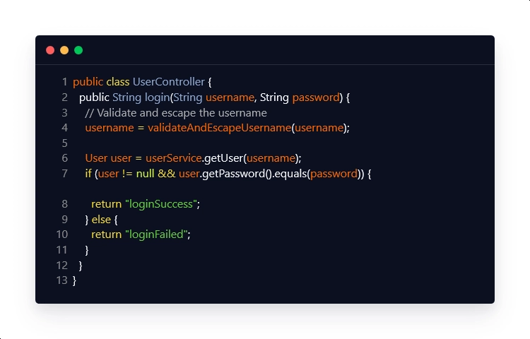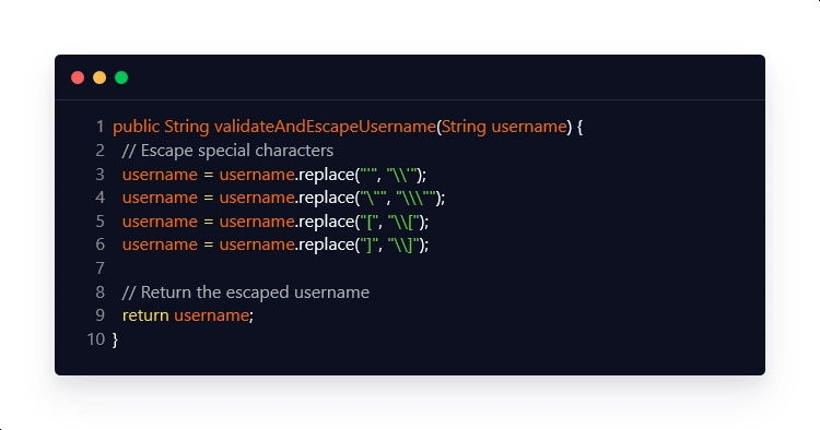 This method utilizes the 'replace' method to remove any single and double quotes, as well as square brackets, from the username. These characters are frequently used in OGNL expressions, and escaping them can aid in the prevention of OGNL injection attacks. The 'login' method is now protected against OGNL injection attacks by using the 'validateAndEscapeUsername' method. Because any special characters used in OGNL expressions are escaped and rendered harmless, an attacker would be unable to inject a malicious OGNL expression into the application.