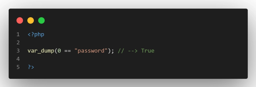 PHP would compare two strings if the program received the POST parameter from the previous example as a string, therefore no type conversion would be required. And it goes without saying that “0” and “password” are separate strings.