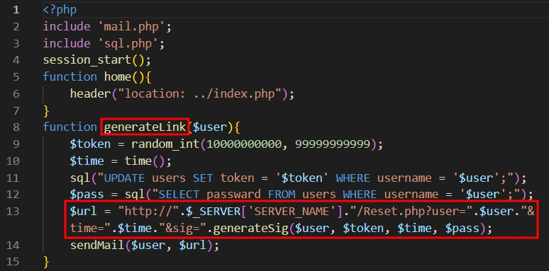Upon closer examination of the function in the source code, we discover that the application creates a random reset token and stores it in the database. It then generates a sha256 hash using the following 4 parameters: