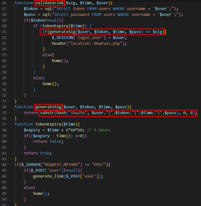 As seen in the below mentioned screenshot, a function called “ValidateLink” checks the URL to reset the password before allowing the user to do so. To validate the link, the function obtains the random token and current password of the user from the database and uses the username and time value from the URL to generate the hash which it then compares (first 8 characters) with the value supplied in the sig parameter of the URL.