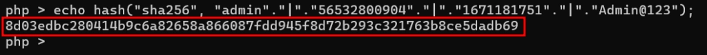 Let’s assume that the username is “admin,” the random token is “56532800904”, the value of time is “1671181751”, and the password is “Admin@123” to better comprehend the procedure. The sha256 hash of these values in this instance will be: