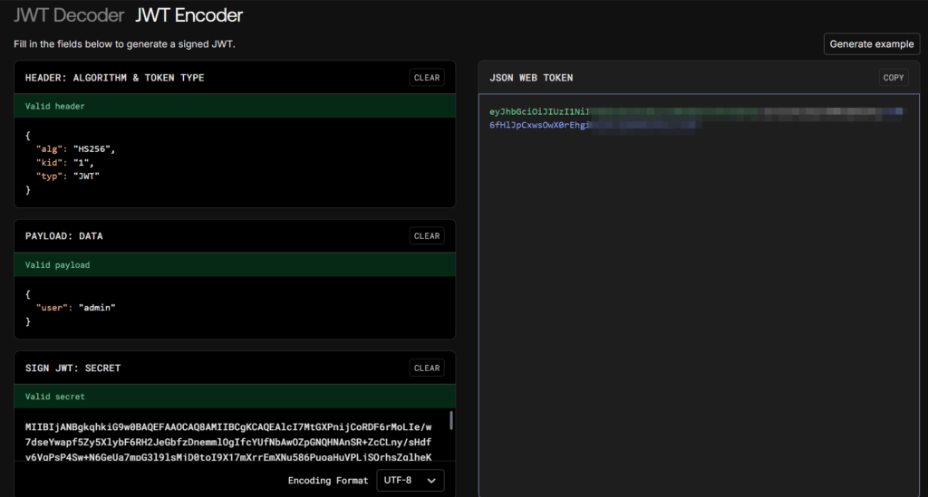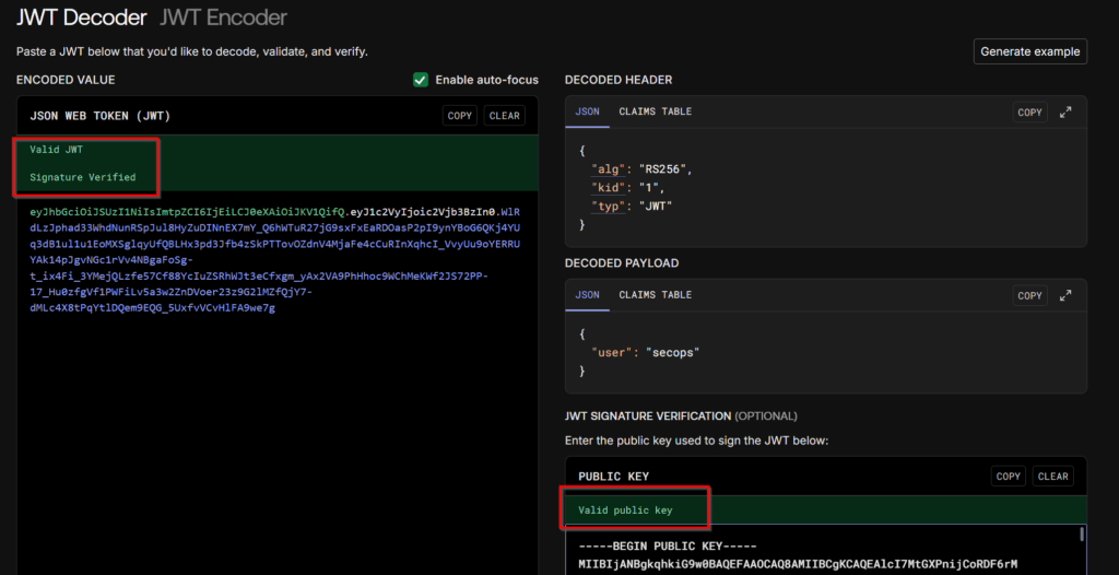 • Header: alg is RS256 (Asymmetric signing) and kid is 1.
