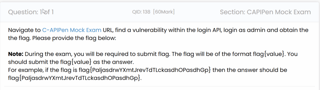 After opening the exam portal, the question gave us a link to the API mock exam. We knew our objective: log in as admin and fetch the flag. Only one question and one API to test in 1 hour – sounds easy, right?