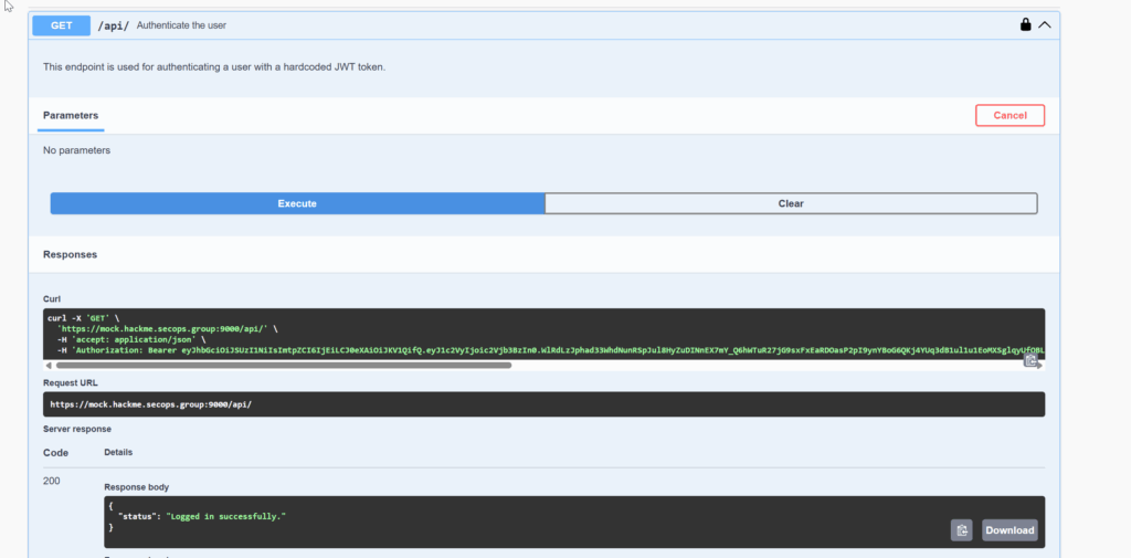 Using Swagger to test the API showed that we received a successful response from the server, confirming the token was valid for the secops user.